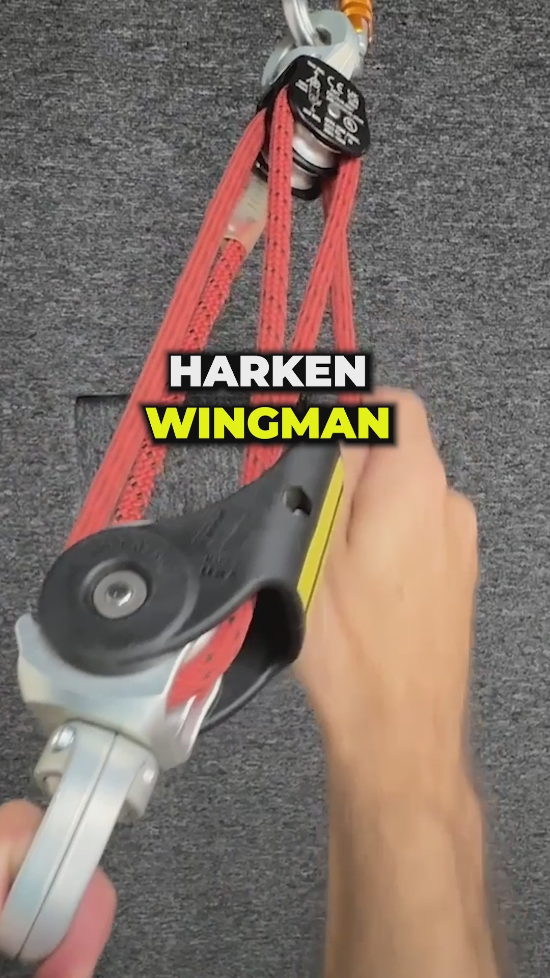 The Wingman is a mechanical-advantage device for load lifting and releasing. It is used in a fall protection or work at height system. It is intended for work at height, access, and rescue use. It can be used for human suspension for up to a 3 kN load. The Wingman consists of two swivel pulleys and a manufacturer supplied rope. One pulley is a double with a becket to dead end the rope. The other pulley is a double with a ratchet and cammed sheave with a releasing handle allowing gradual release of the mechanical advantage system under load. The releasing handle is located at the operator end. Anodized aluminum is used throughout the pulleys. The handle is glass reinforced nylon. The rope is an 8 mm static polyester with a sewn termination and is not to be substituted. Pulleys have stainless steel axles and fasteners. The ratchet mechanism is stainless steel.